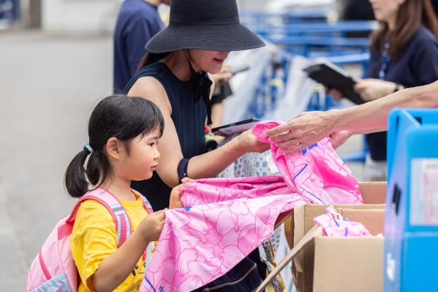 さて、集合場所の「ナゴヤ球場」には続々と参加者の皆さまが。受付時に軍手、トング、ゴミ袋の3点セットにプラスして、今年も「昇竜レプリカユニホーム」が配られました。ユニホームはかわいいピンクのサクラ柄。実はこれ、4月の試合でのみ配られた限定品。他では配られることのない貴重な一品に参加者からは「4月の試合に行けずもらえなかったので、もらえてうれしい!大切にします!」と言う声が聞かれました。皆さんにそんなユニホームを着ていただくと、集合場所は季節外れのサクラが満開です!