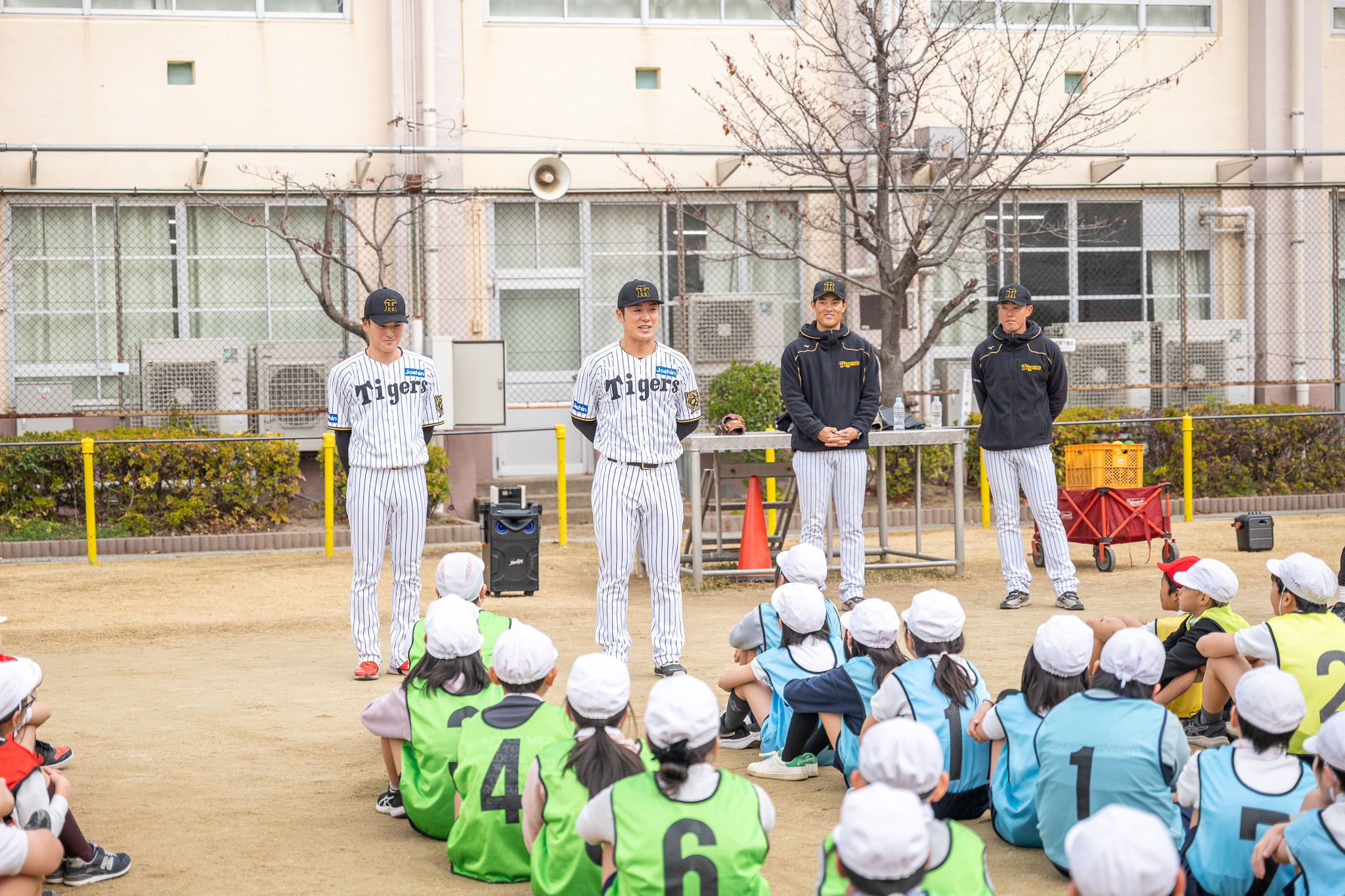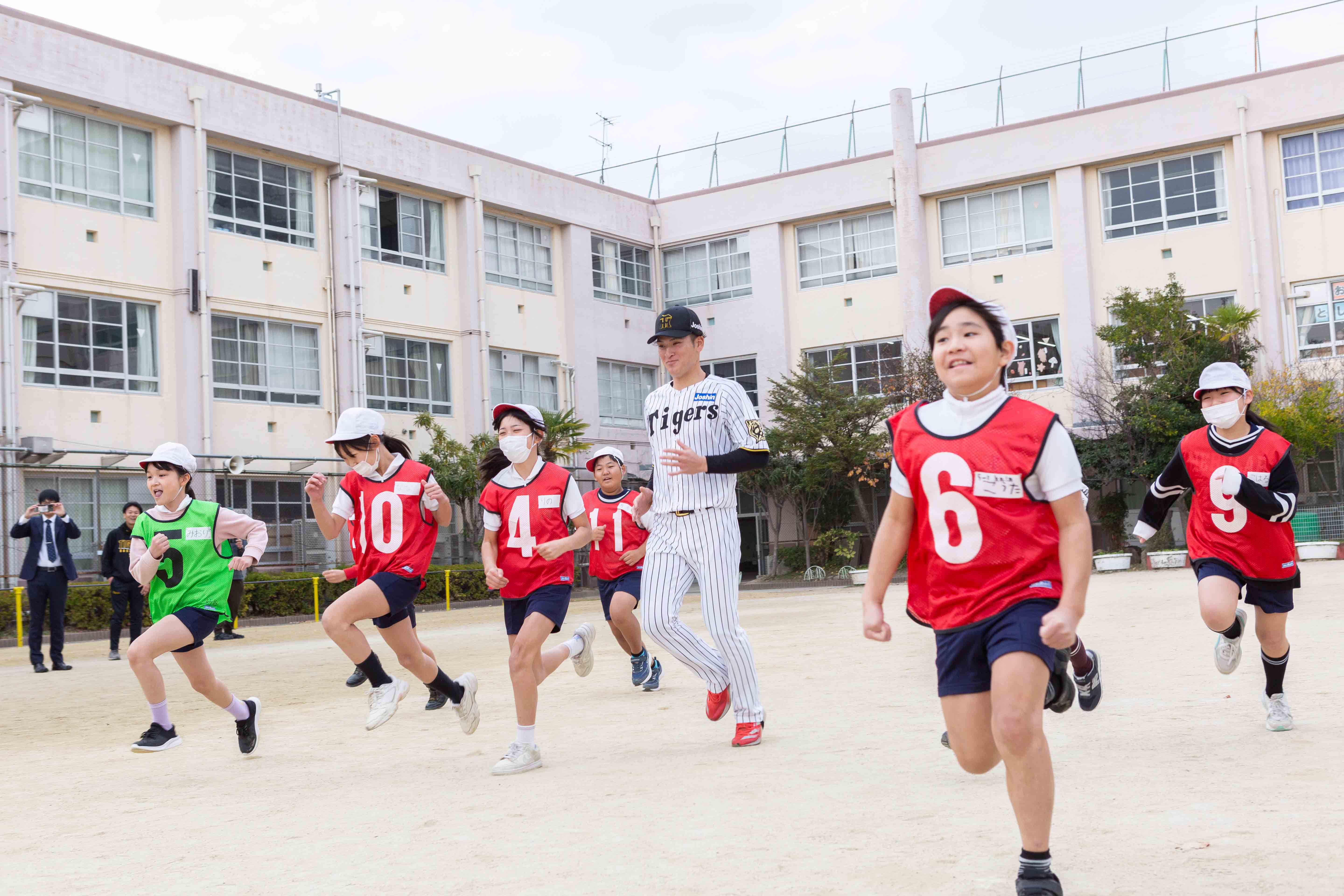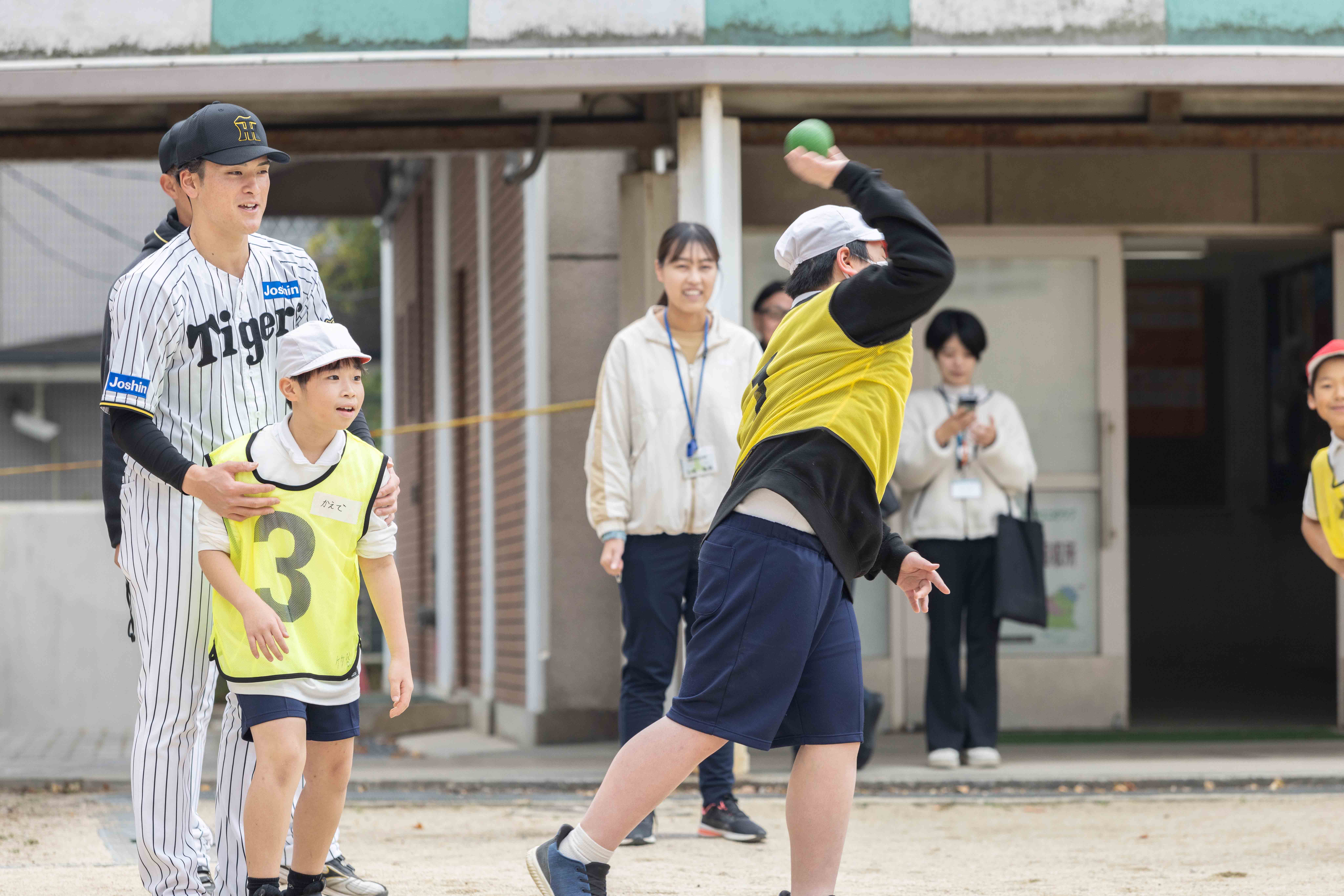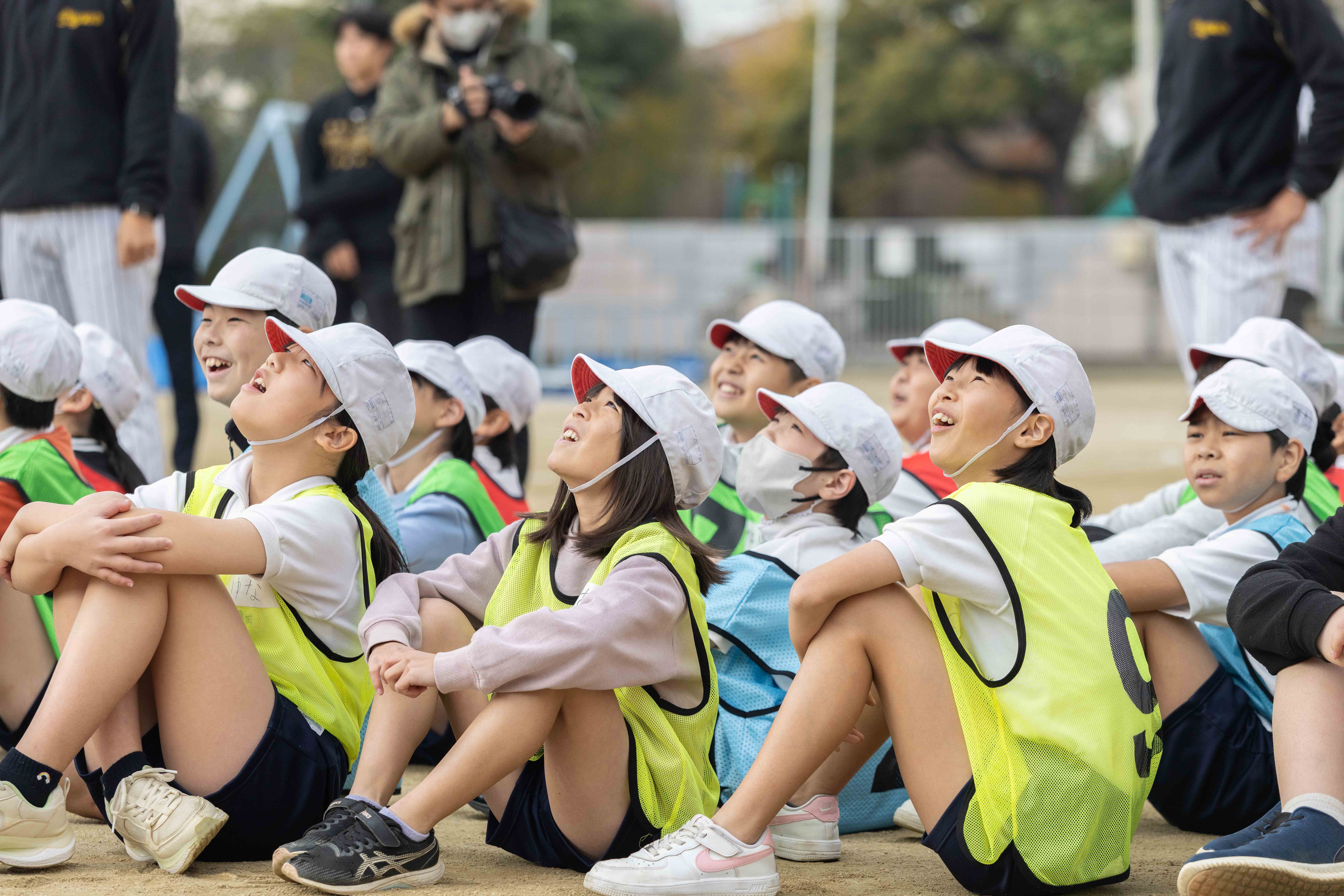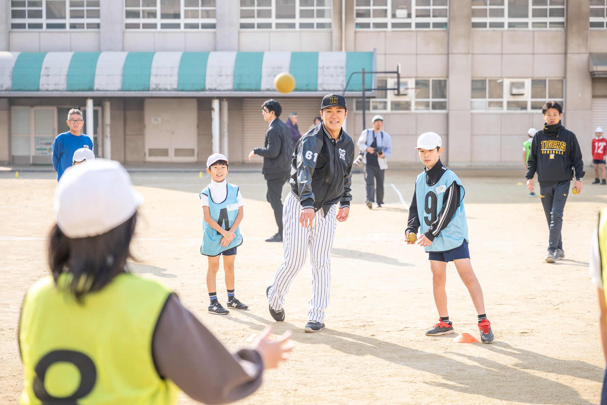 休憩を挟み、舞台は校庭へ。12月とは思えない陽気で、日向に立つとコートがいらないほど。ここからは阪神タイガースアカデミーの望月惇志コーチ、髙濱祐仁コーチも加わります。元プロ野球選手でもある2人の存在に、子どもたちのテンションはさらに上がりました。