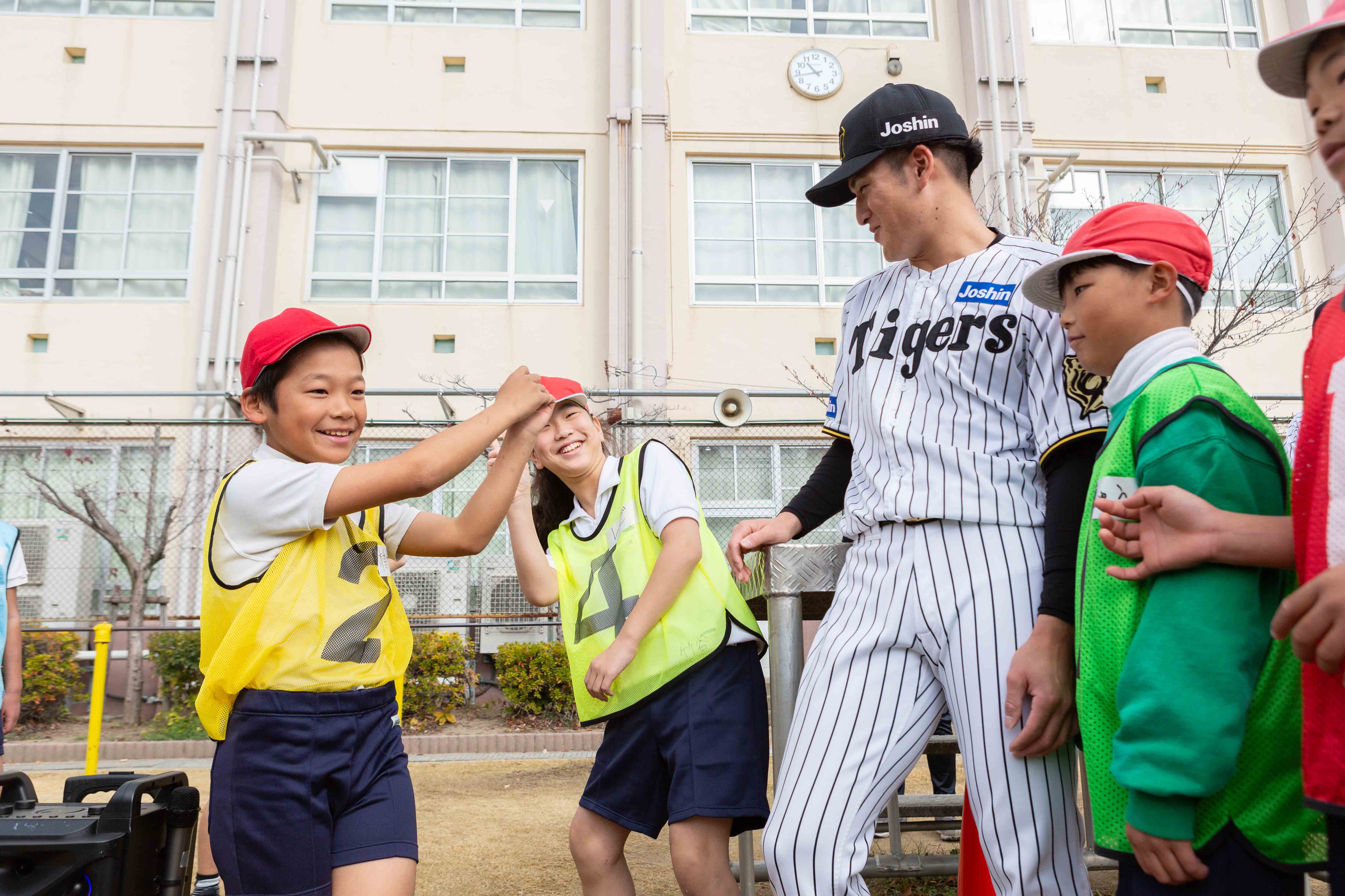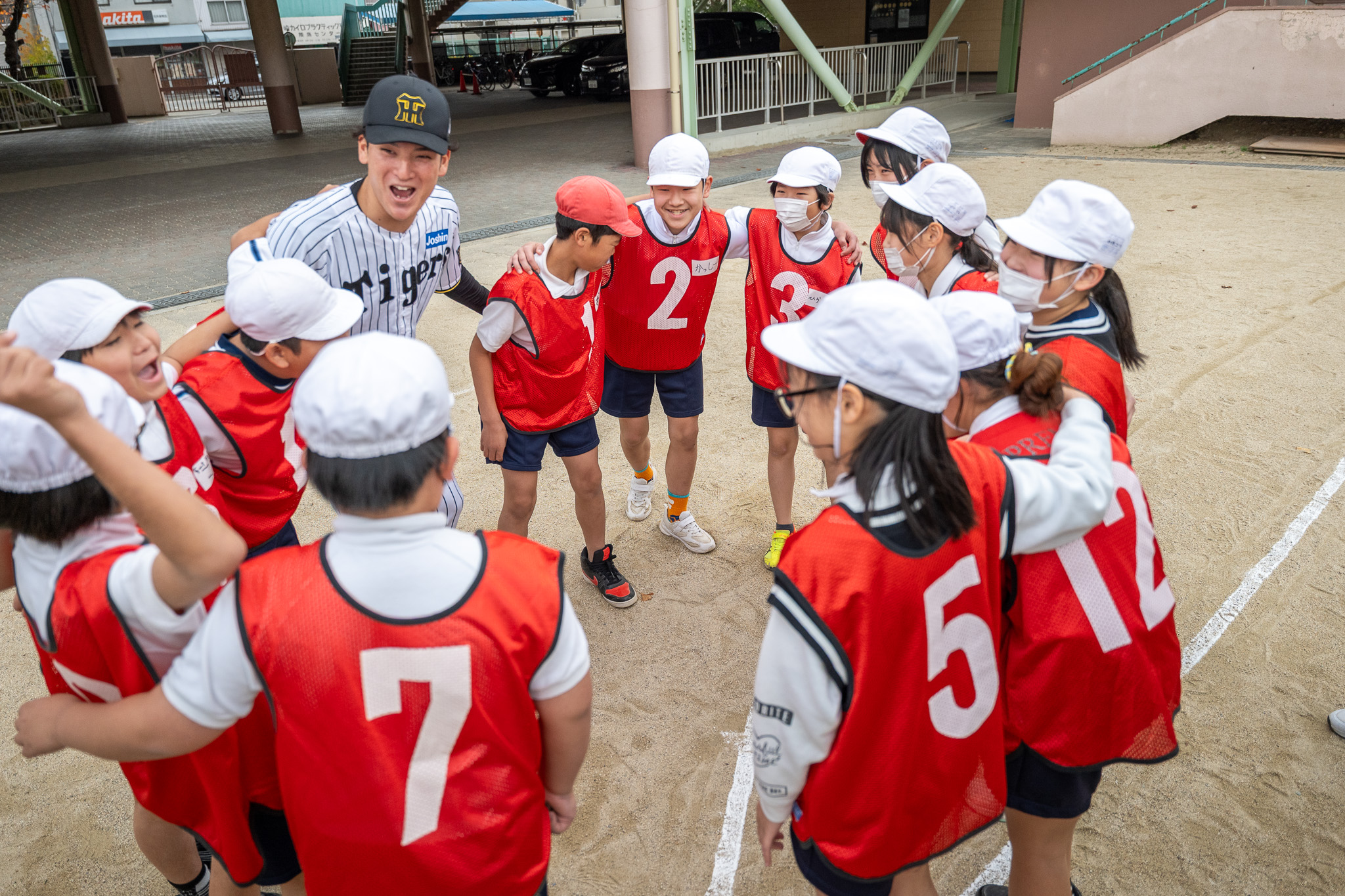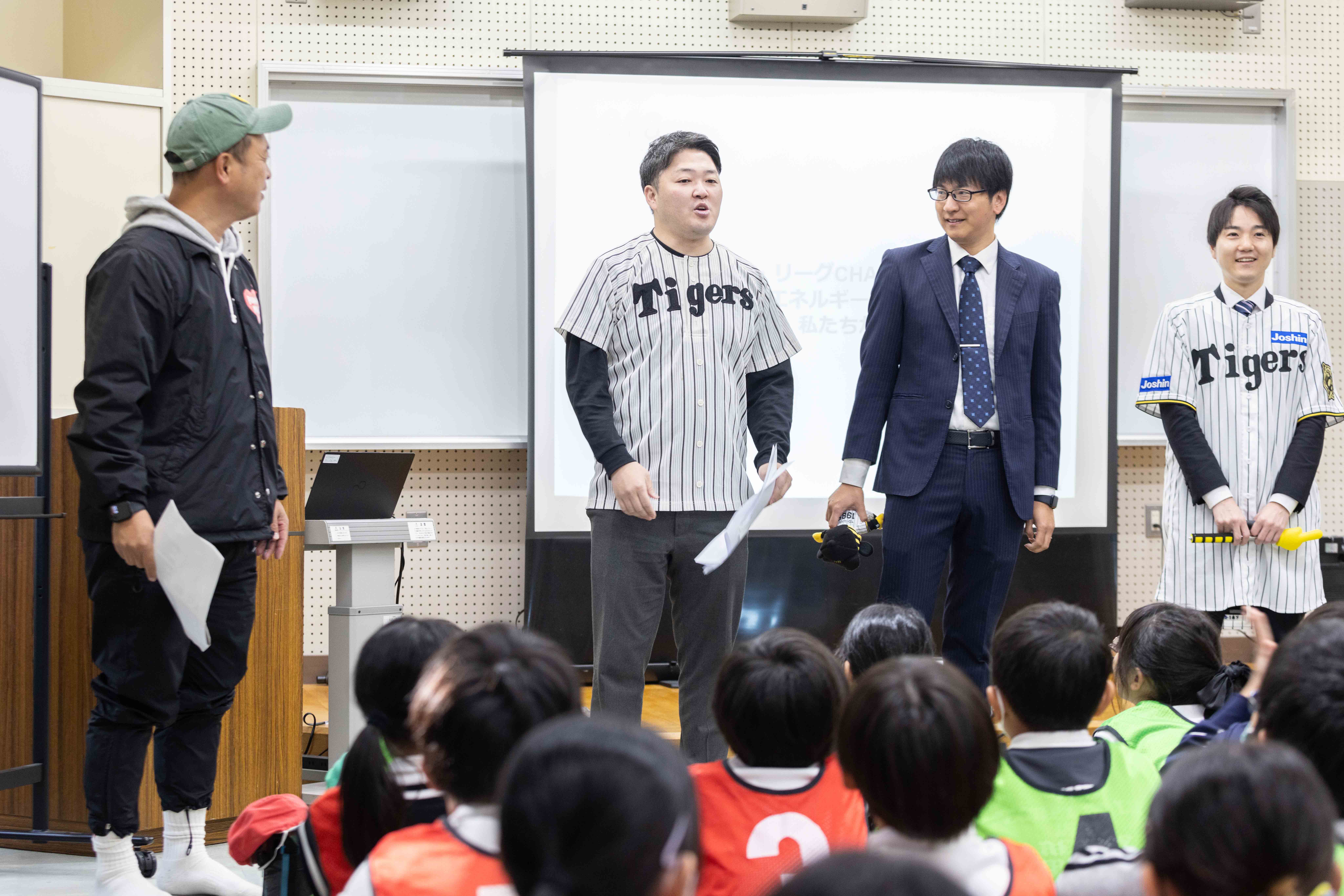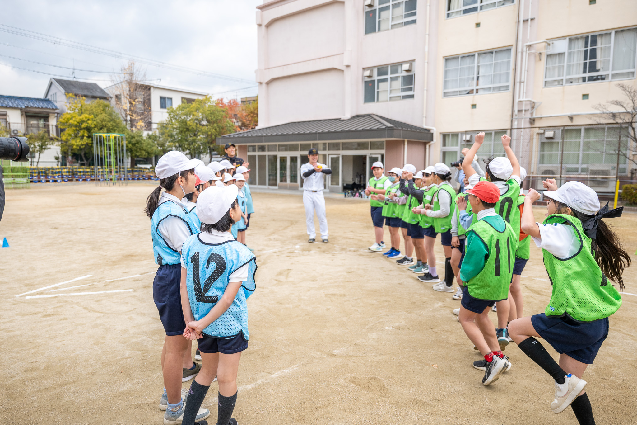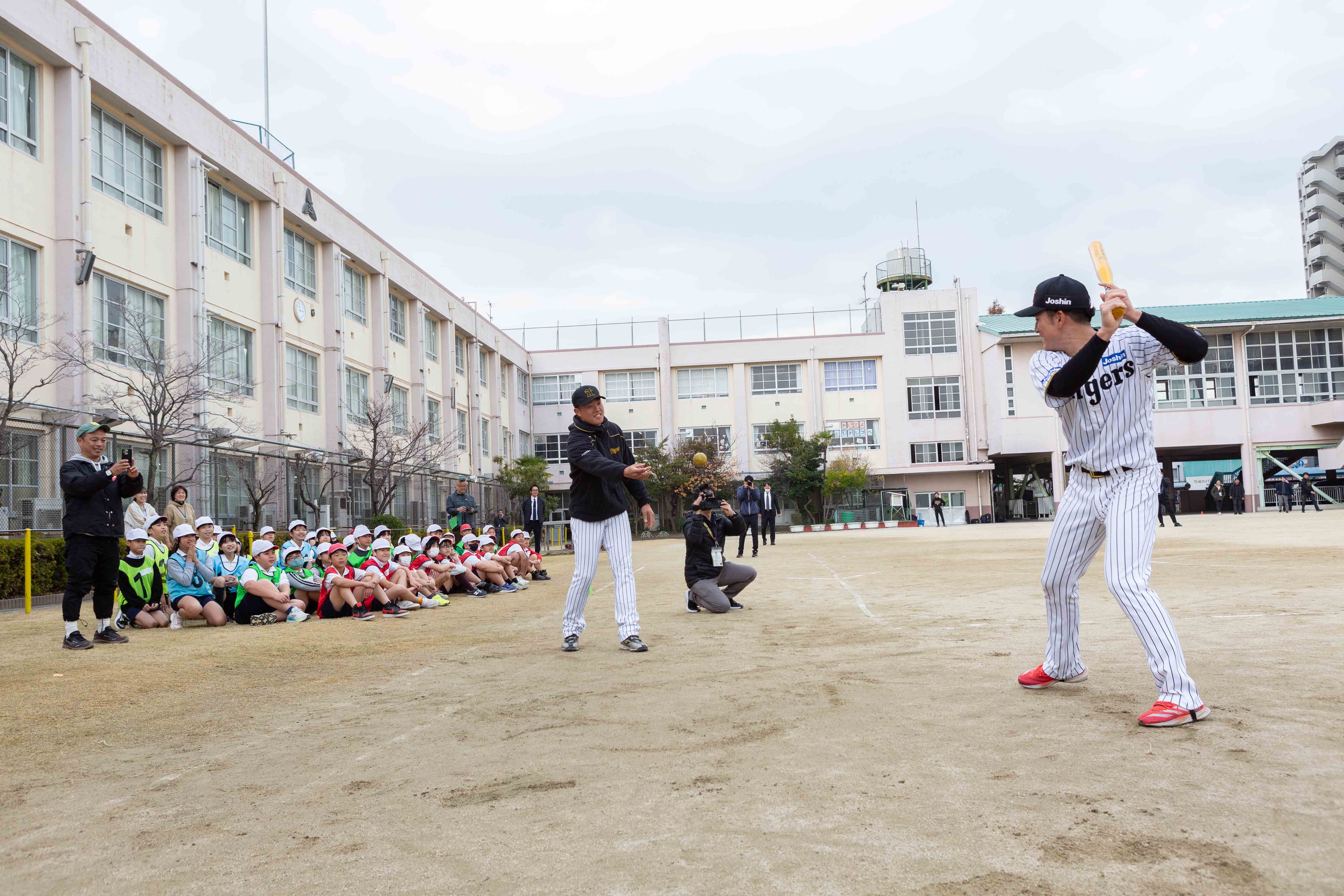 休憩を挟み、舞台は校庭へ。12月とは思えない陽気で、日向に立つとコートがいらないほど。ここからは阪神タイガースアカデミーの望月惇志コーチ、髙濱祐仁コーチも加わります。元プロ野球選手でもある2人の存在に、子どもたちのテンションはさらに上がりました。