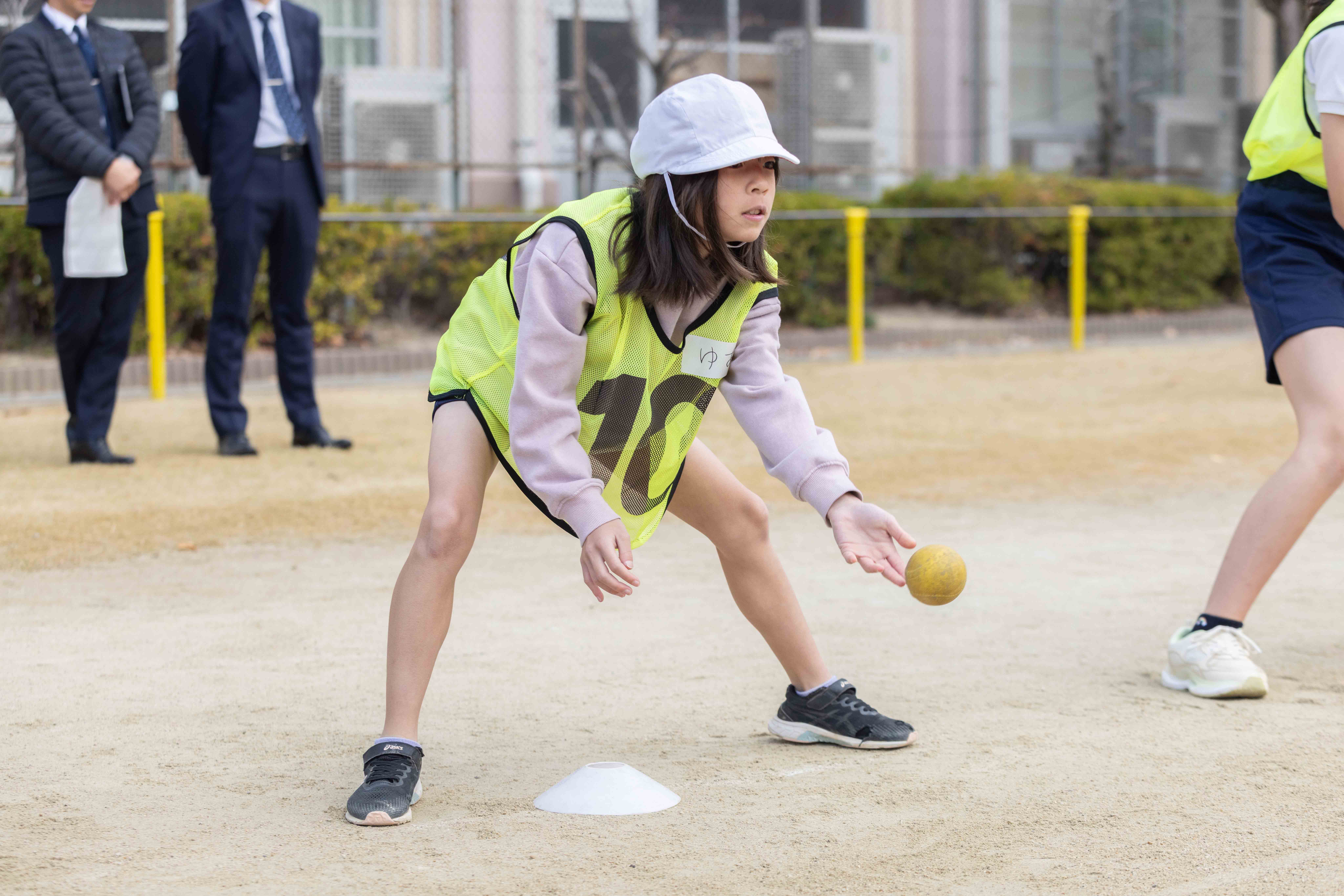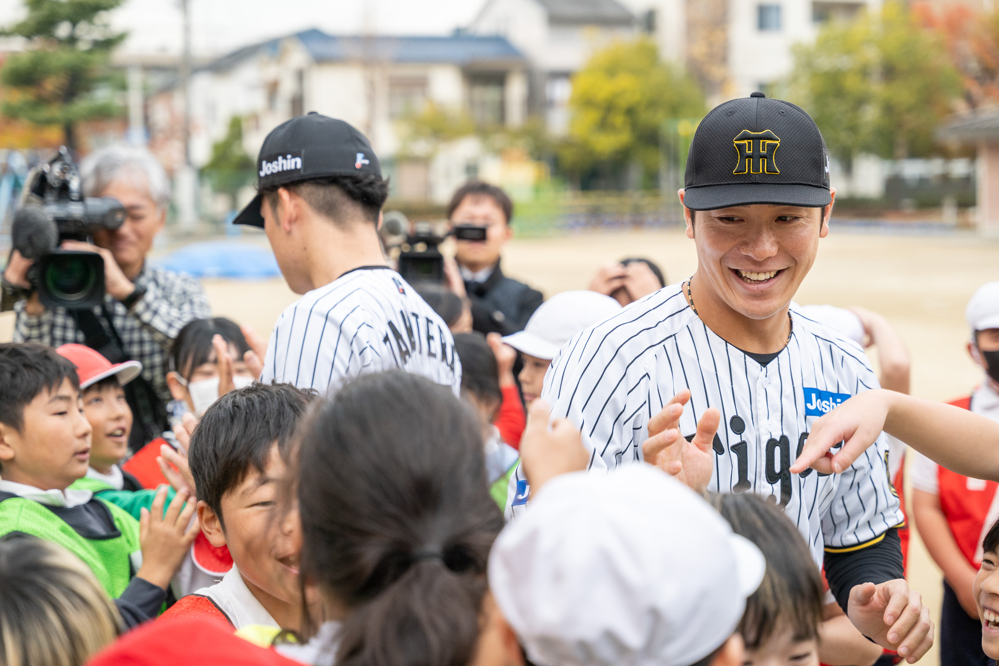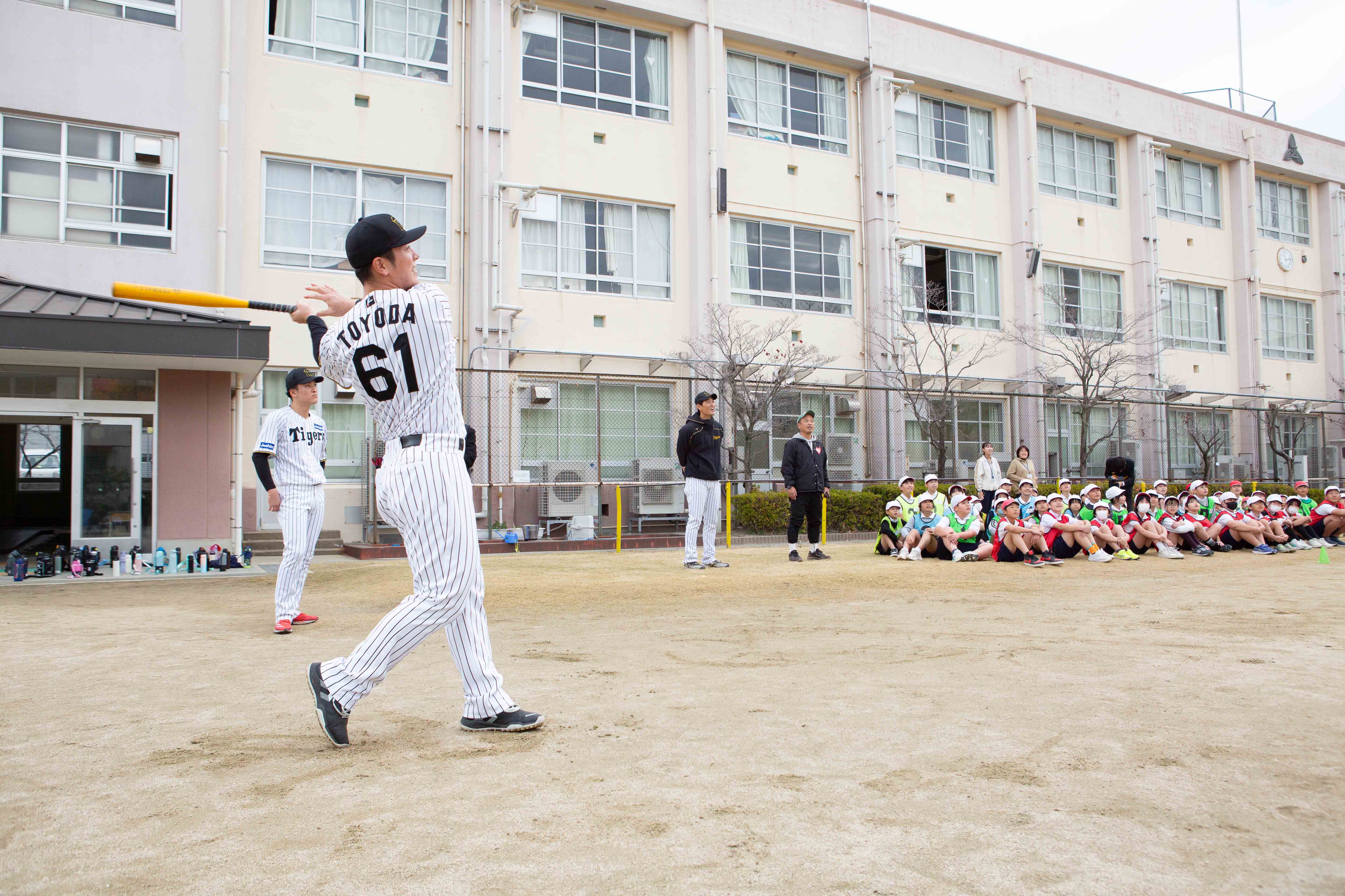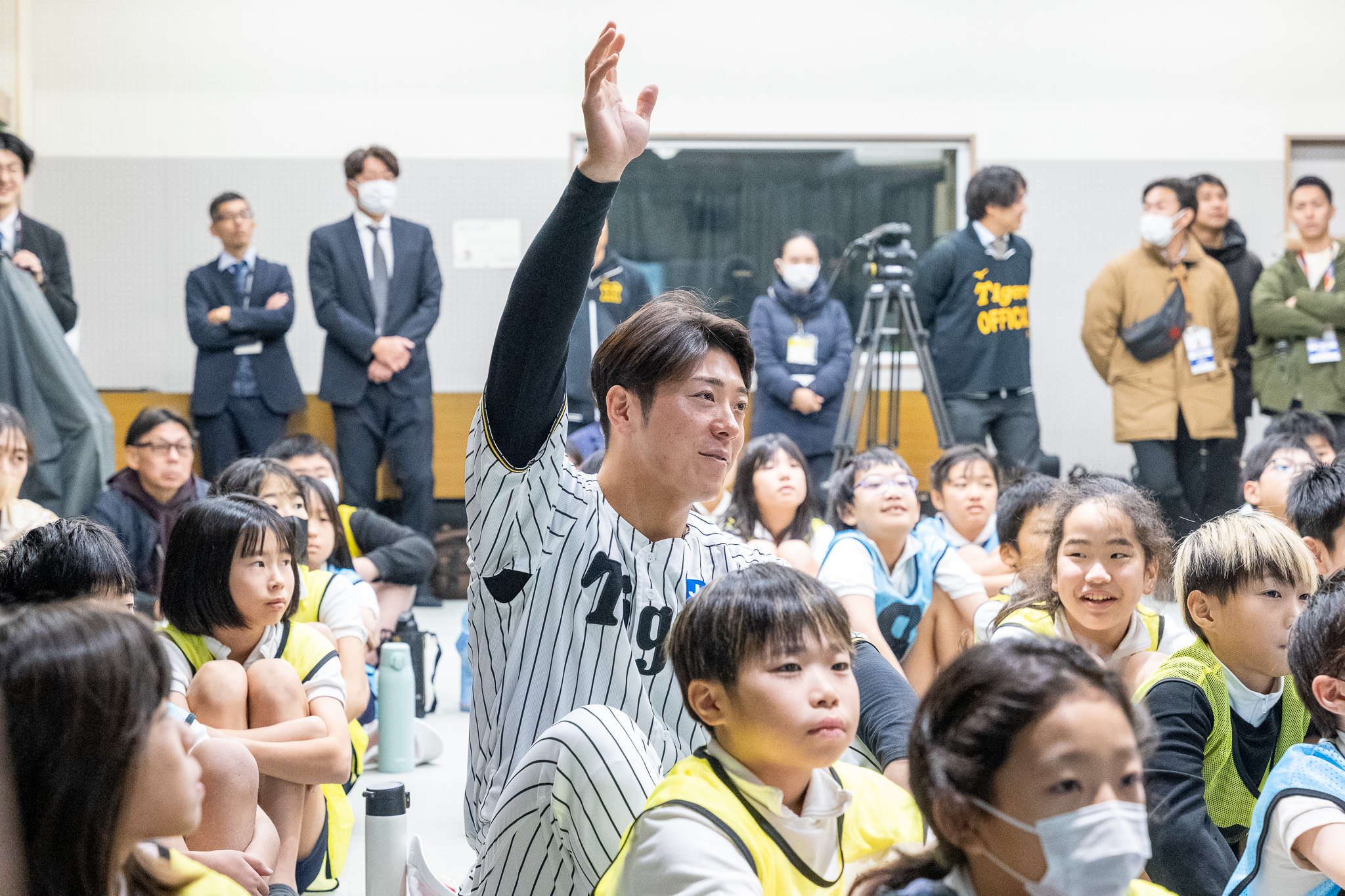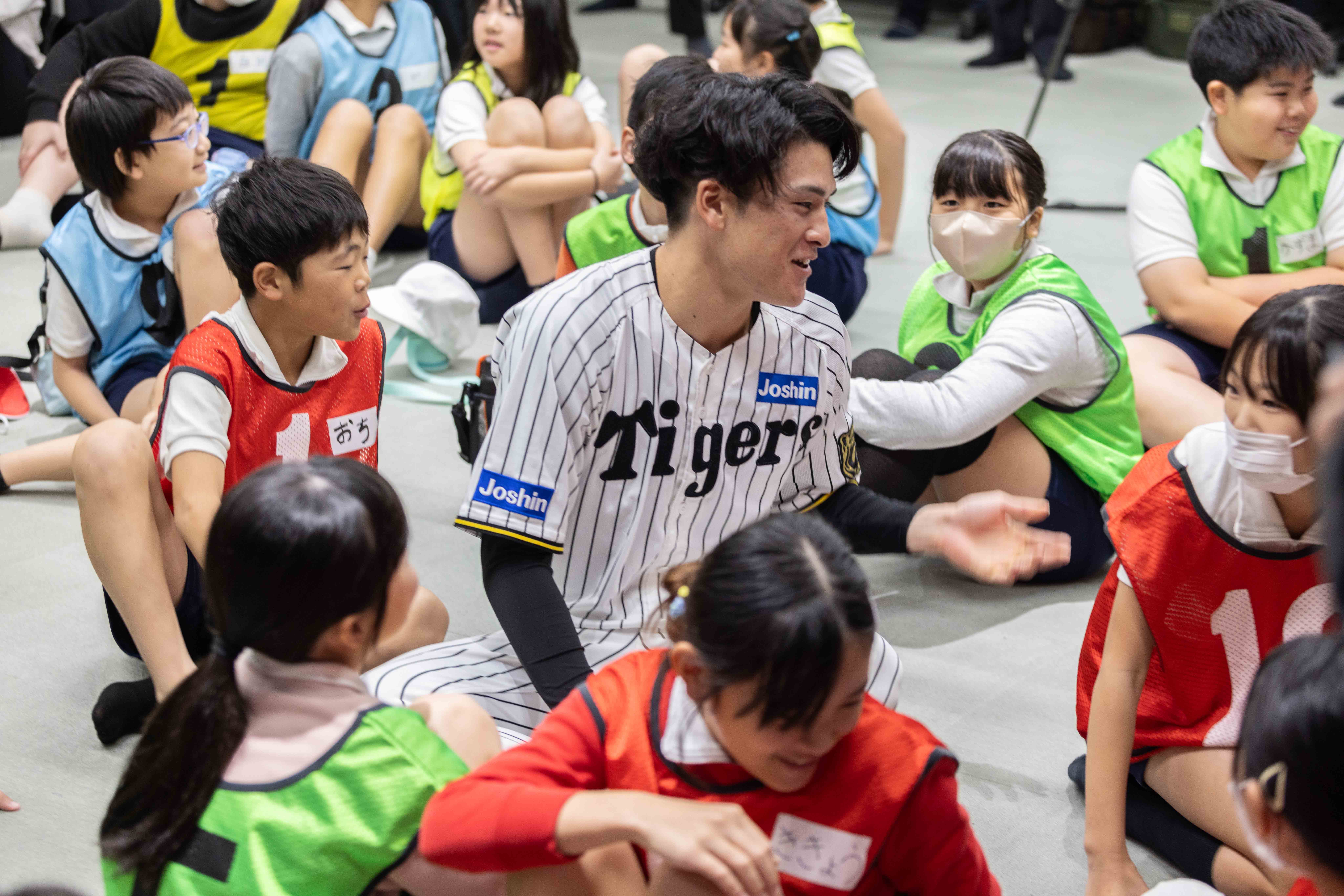 休憩を挟み、舞台は校庭へ。12月とは思えない陽気で、日向に立つとコートがいらないほど。ここからは阪神タイガースアカデミーの望月惇志コーチ、髙濱祐仁コーチも加わります。元プロ野球選手でもある2人の存在に、子どもたちのテンションはさらに上がりました。
