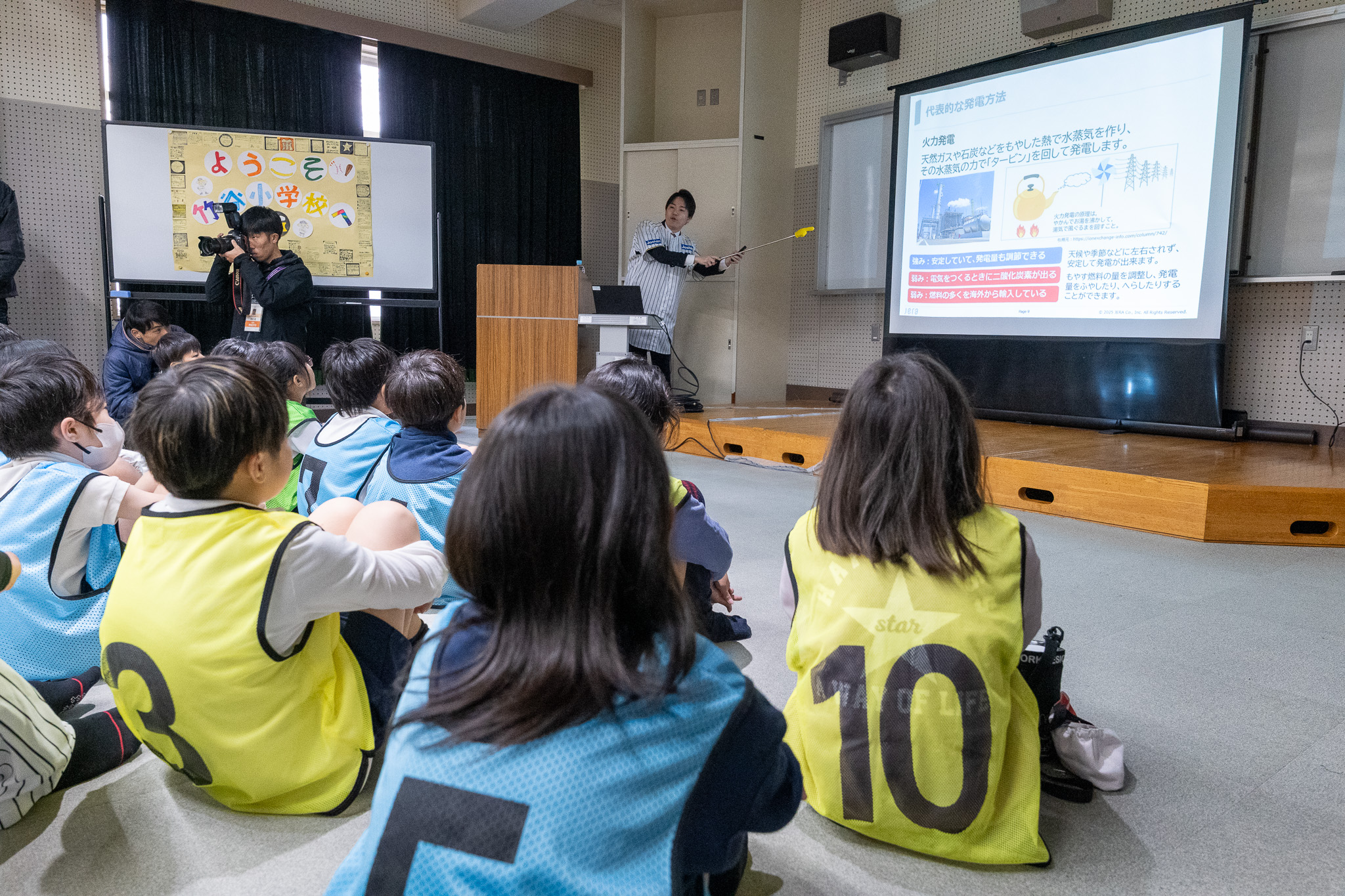 まずはJERA講師による「環境エネルギー教室」からスタート。選手たちも子どもたちの列に混じって座り、一緒に授業を受けます。