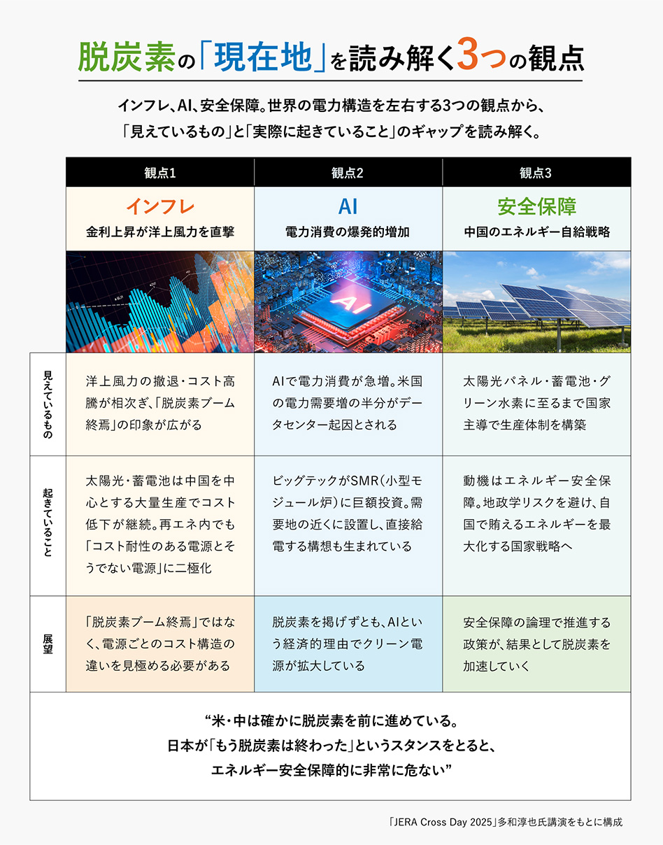 「脱・脱炭素」論に流されず、ファクトベースで水面下のメガトレンドを正確に読み、行動していくこと。それが多和氏の主張の核心にある。