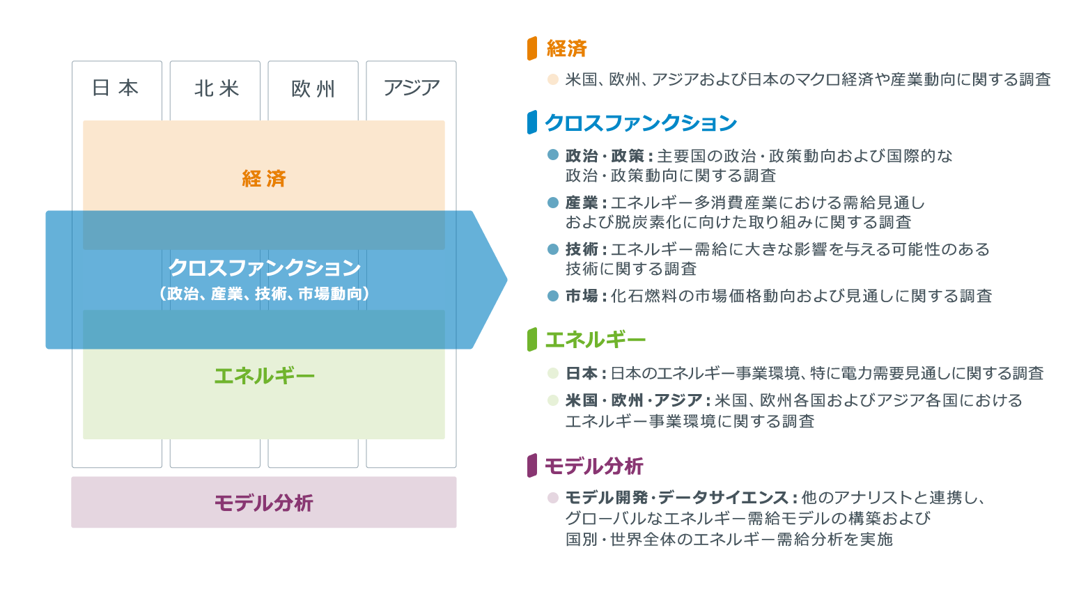 JERA Global Instituteは、グローバルおよび日本、北米、欧州、アジアの主要地域について、エネルギー・環境分野のみならず、マクロ経済、政治、主要産業、技術の進展、市場動向等を幅広く調査・分析します。事業環境を包括的に捉え、インテリジェンスを提供するため、地域別機能と分野横断機能(クロスファンクション)を組み合わせた組織で活動します。ここに、数理モデルによるデータ分析機能を加えることで、定性・定量の両面から調査・分析に取り組みます。
