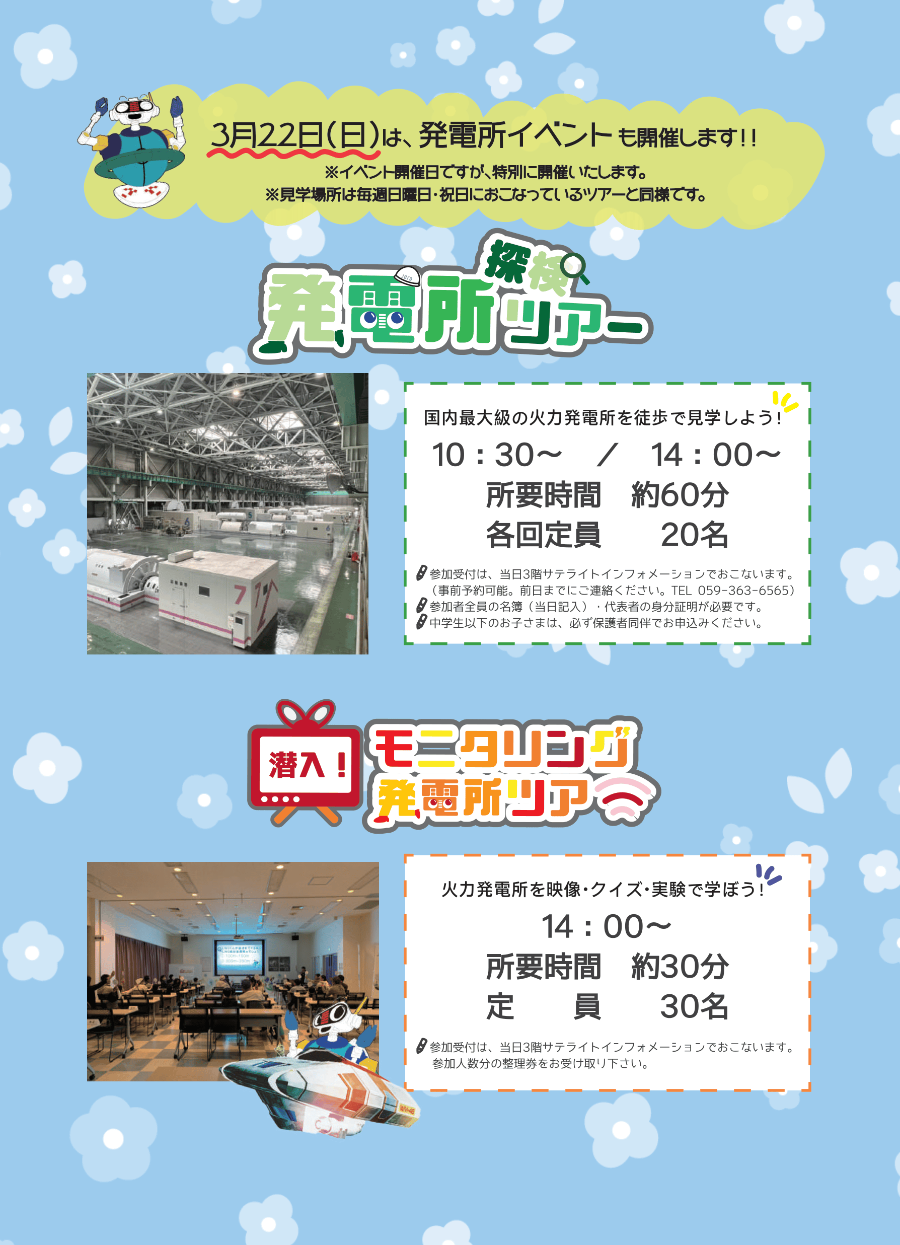 ・受付場所と記念品引換場所は、3階サテライトインフォメーションです。 ・22日(日)は「発電所探検ツアー」と「モニタリング発電所ツアー」も開催します。 ※通常イベント時には開催しておりませんが、今回のみ開催いたします。 ・荒天時や緊急時、急遽イベントが中止・変更になる可能性があります。あらかじめご了承ください。 |