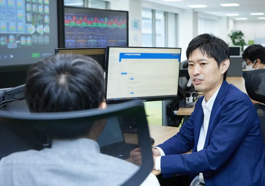 需給オペレーションを担当し、電力供給の経済性向上に取り組んでいるK.Oさん。発電計画の作成や市場取引を通じて、リスクに柔軟に対応し、効率的な計画を実現。川越火力発電所での経験を活かし、発電所との連携を強化しながら、より精緻な計画を作成しています。