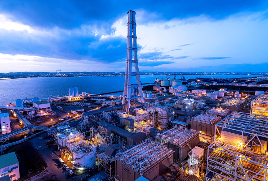 石炭火力としては国内最大、世界でも最大級の総出力410万kWの火力発電所。CO₂を排出しないゼロエミッション火力発電の実現に向けた第一歩として、世界に先駆けてアンモニアの燃料利用に取り組んでいます。面積約30万㎡の貯炭場や、複数の地域共生施設など多様な設備を備えています。