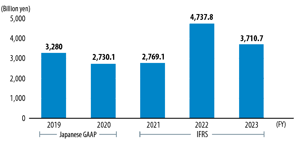 In FY2023, operating cash flow increased by 874.1 billion yen compared with the previous year, driven by factors such as an increase in pre-tax profit due to the improvement of time lag-related gains and losses, as well as decreases in accounts receivable and inventory. Investment cash flow increased by 159 billion yen compared with the previous year due to increased expenditures related to the acquisition of affiliated companies. Free cash flow increased by 715.1 billion yen.