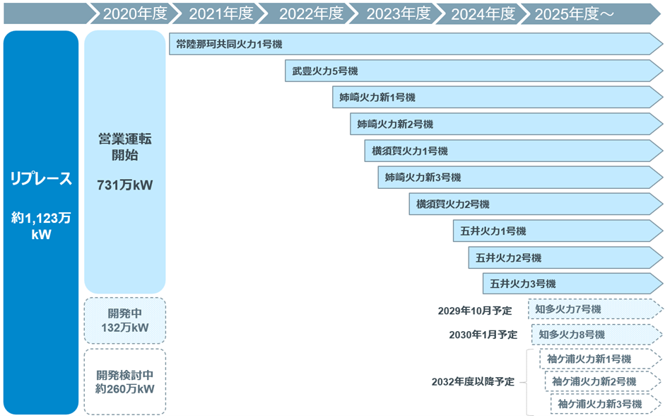 当社は、高経年化した火力発電設備を最新鋭機に更新していくことで、長期的な電力の安定供給と脱炭素社会の実現に貢献することとしており、2020年度以降で731万kWの新設・リプレースを実施しております。加えて、2029年度の運転開始に向けて知多火力発電所7・8号機の新設工事(131.98万kW)を進めるとともに、2032年度以降の運転開始に向けた袖ケ浦火力発電所新1~3号機(約260万kW)の新設の検討も進めており、環境影響評価の準備を開始しています。