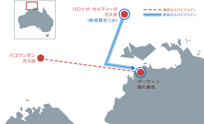 バロッサガス田は、ダーウィンLNGプロジェクトに原料ガスを供給するバユ・ウンダンガス田の生産終了を見据え、後継ガス田として開発を進めてきました。本プロジェクトは、バロッサガス田の開発およびダーウィンLNG液化基地への繋ぎこみを行いLNGを生産するものです。当社は、本プロジェクトから年間約42.5万トンの権益相当分のLNGを引き取ります。
