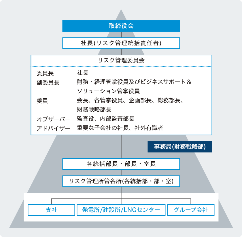 当社は、エネルギーの安定供給をはじめとした重要な社会的責任を果たすために、社長 CEO兼COOを統括責任者とする実効性の高いリスクマネジメント体制を構築しています。